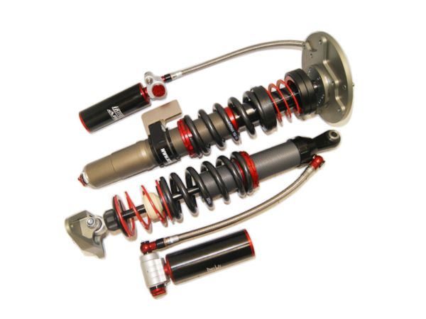 Where possible, the housing of the 4-Way shock absorber is made of high-quality aluminium (if desired or required, it can also be made of steel). This guarantees a low weight, maximum strength and optimal cooling. Whilst designing the 4-Way shock absorber, the largest possible diameter is chosen for an even more accurate control of the damping; usually a 52mm housing with 46mm piston. Where possible, Macpherson struts are fitted as upside-downs with a 45mm diameter instead of a thin piston rod that is mounted to the chassis.