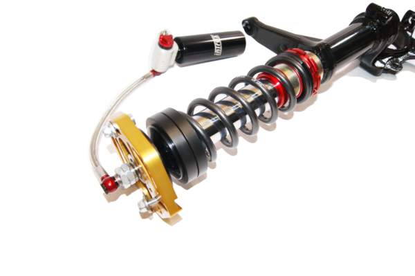Where possible, the housing of the 4-Way shock absorber is made of high-quality aluminium (if desired or required, it can also be made of steel). This guarantees a low weight, maximum strength and optimal cooling. Whilst designing the 4-Way shock absorber, the largest possible diameter is chosen for an even more accurate control of the damping; usually a 52mm housing with 46mm piston. Where possible, Macpherson struts are fitted as upside-downs with a 45mm diameter instead of a thin piston rod that is mounted to the chassis.